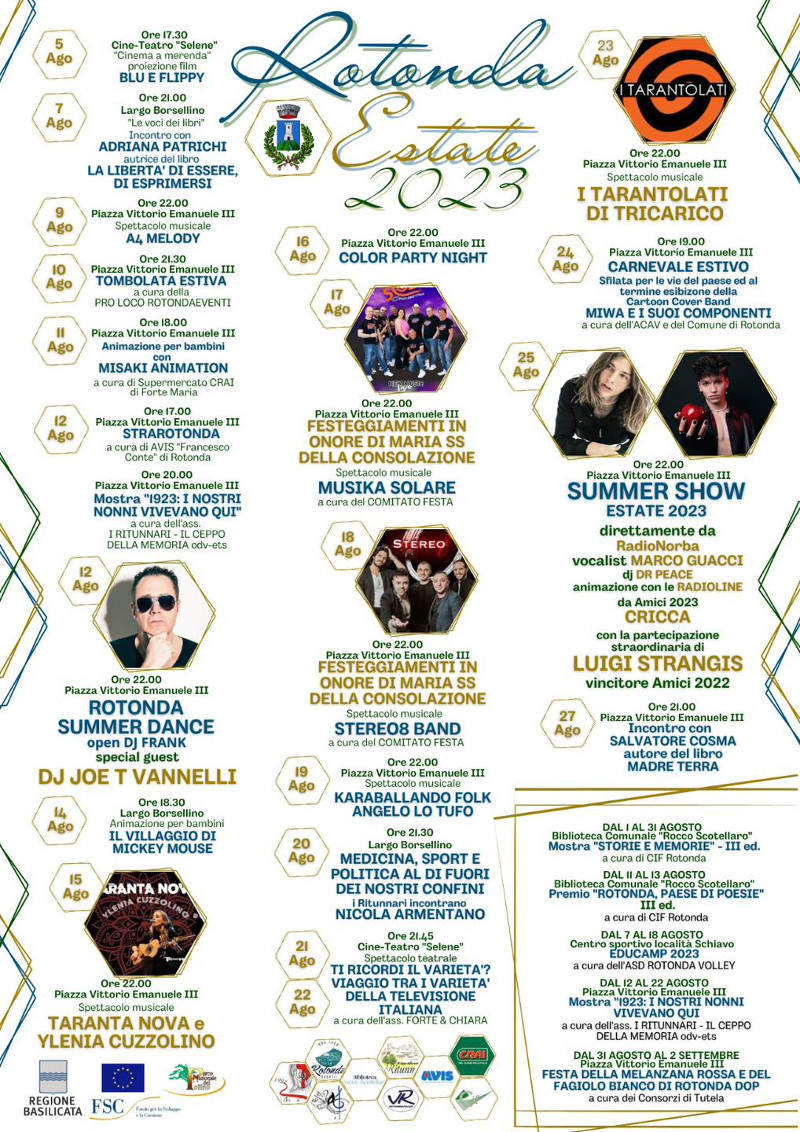 Ricco il cartellone dell’Estate 2023 che l’Amministrazione comunale di Rotonda, ha programmato per il mese di agosto e settembre che spazia da momenti culturali, allo spettacolo, al sociale, all’intrattenimento, all’animazione per bambini, alla proiezione di film, teatro e allo sport.
