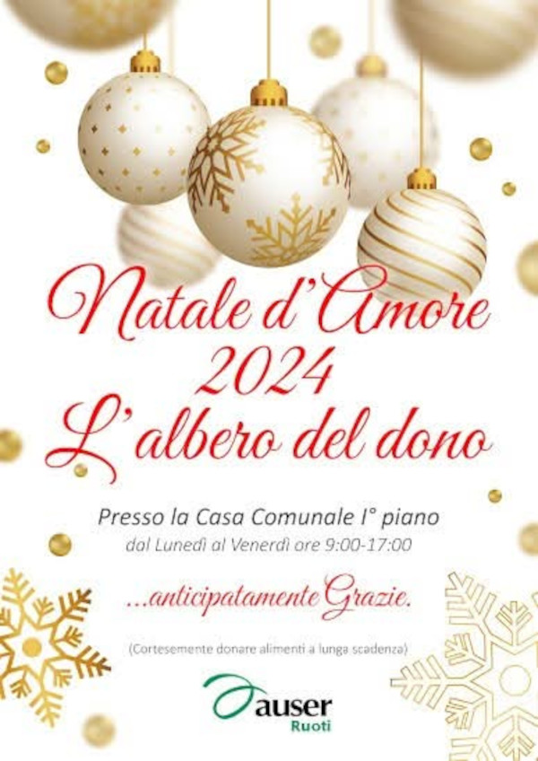 Il Comune di Ruoti informa che quest’anno, Auser Volontariato Ruoti invita tutti a compiere un gesto di amore e solidarietà: donare alimenti a lunga scadenza per regalare un Natale più sereno a chi ne ha bisogno.