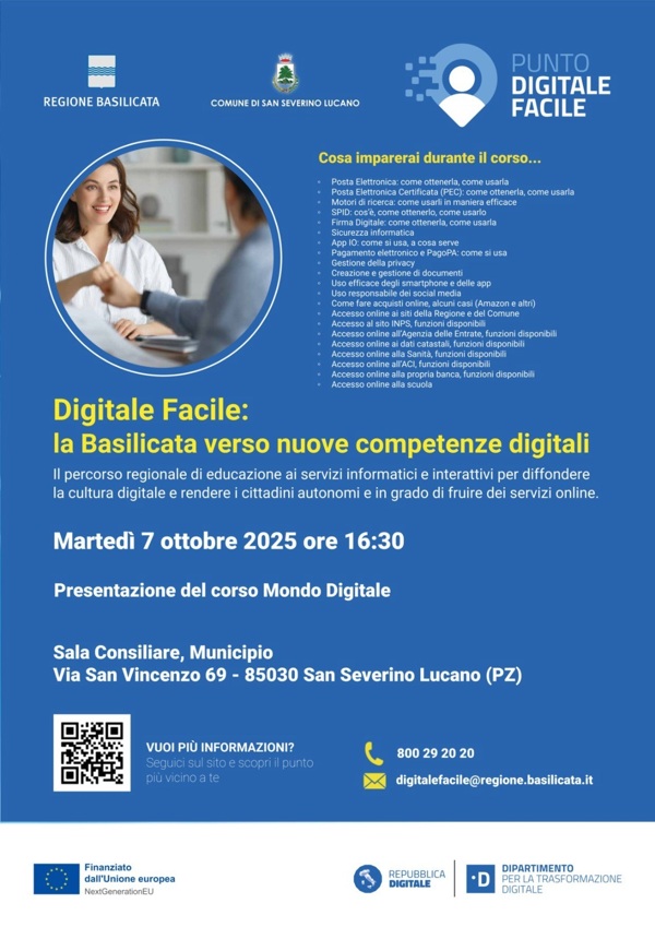 Ricordiamo inoltre che “Digitale Facile – Rete dei servizi di facilitazione digitale”, è un progetto inquadrato nell’ambito della misura nazionale 1.7.2 del PNRR (Piano Nazionale di Ripresa e Resilienza) del Dipartimento per la Trasformazione Digitale della Presidenza del Consiglio dei Ministri e realizzato dalla Regione Basilicata.