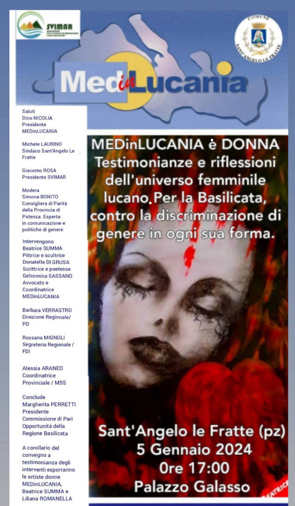 “Medinlucania è donna. Testimonianze e riflessioni dell’universo femminile lucano. Per la Basilicata, contro la discriminazione di genere in ogni sua forma”, questo il tema del convegno che si svolgerà venerdì prossimo 5 gennaio alle ore 17:00 a Sant’Angelo le Fratte (Palazzo Galasso).