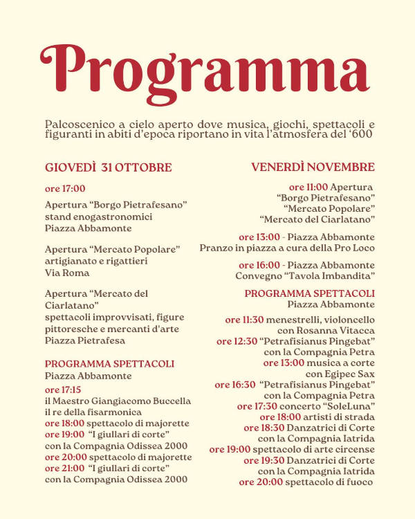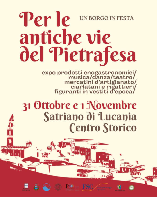 A Satriano di Lucania, due giorni di musica, spettacoli di danza e teatro con oltre 25 artisti, esposizioni enogastronomiche, mercatini d’artigianato, rigattieri, figuranti in costumi d’epoca, artisti circensi per divertire grandi e piccini.