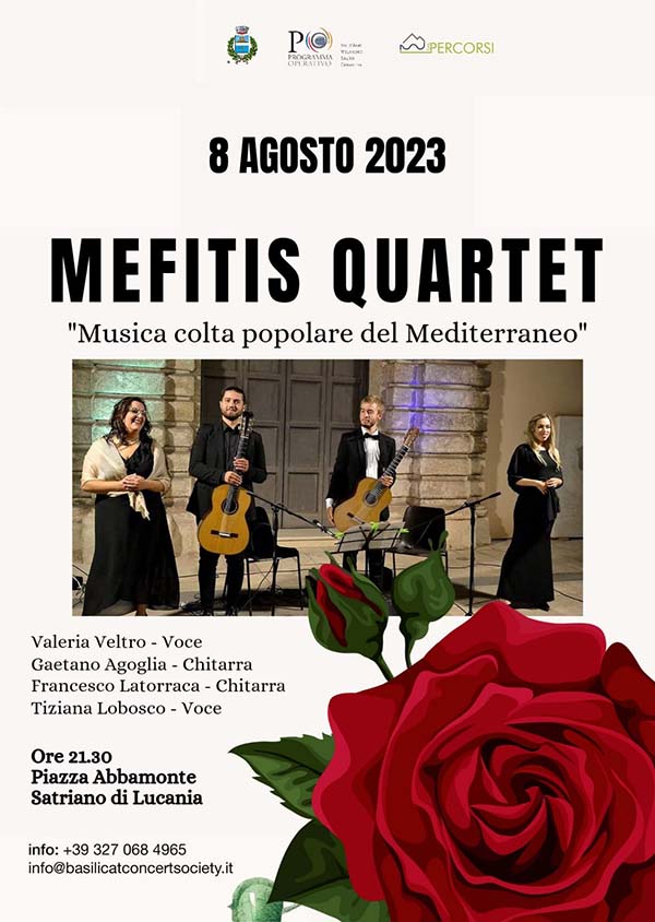 Martedì’ 8 Agosto alle ore 21:30 in Piazza Abbamonte a Satriano di Lucania andrà in scena il concerto “Musica colta popolare del Mediterraneo” eseguito dal Mefitis Quartet.