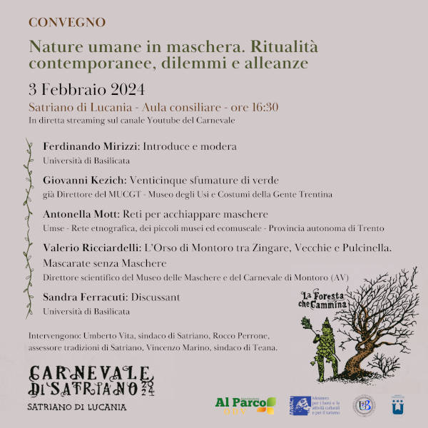 Si terrà il 3 Febbraio alle 16:30, presso l’aula consiliare di Satriano di Lucania, il convegno dal titolo “Nature umane in maschera. Ritualità contemporanee, dilemmi e alleanze”.