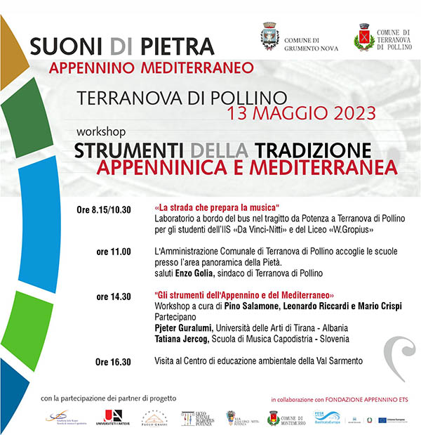 L’evento dal titolo “Strumenti della tradizione appenninica e mediterranea” a Terranova di Pollino, comune partner del progetto, di cui è capofila il comune di Grumento Nova di un partenariato ampio che coinvolge anche il comune di Montemurro, le scuole IIS “Da Vinci – Nitti” e liceo artistico “W.Gropius” di Potenza, la Fondazione Paolo Grassi di Martina Franca e mette a sistema anche le esperienze straniere delle Università delle Arti di Tirana e la Scuola di Musica di Capodistria.