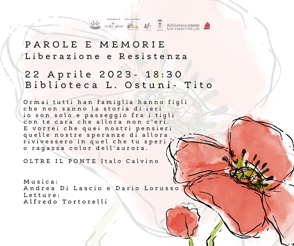 In occasione della Festa della Liberazione, l’APS Sotto il Castello presenta la IV edizione di Parole e Memorie – Liberazione e Resistenza, che si terrà Sabato 22 Aprile 2023, alle ore 18:30 presso la Biblioteca Comunale Lorenzo Ostuni in via Convento a Tito.