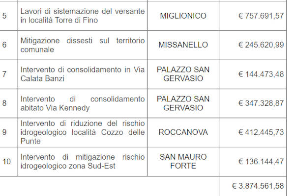 Lo rende noto il presidente della Regione in qualità di commissario di governo per il contrasto al dissesto idrogeologico, che aggiunge: