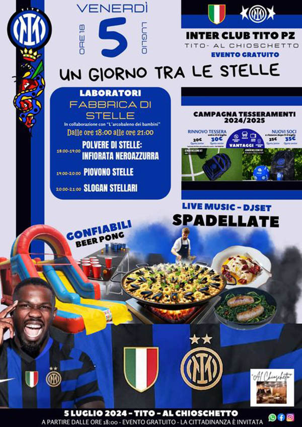 Venerdì 5 Luglio a partire dalle ore 18:00, al Al Chioschetto a Tito, l’InterClub Tito-Potenza organizza “𝐔𝐍 𝐆𝐈𝐎𝐑𝐍𝐎 𝐓𝐑𝐀 𝐋𝐄 𝐒𝐓𝐄𝐋𝐋𝐄”, l’ormai consueto appuntamento estivo per grandi e soprattutto giovani tifosi neroazzurri!