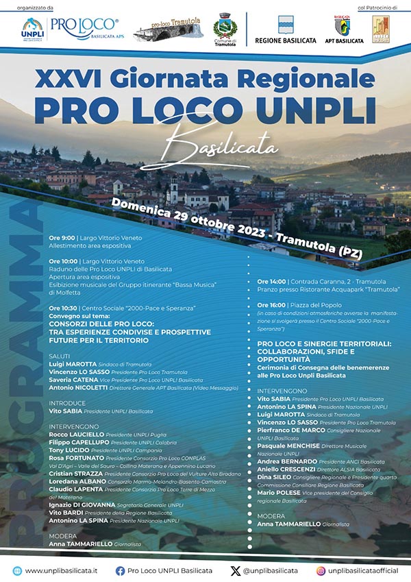 Dal 1994 il Comitato Pro Loco UNPLI Basilicata organizza la Giornata Regionale delle Pro Loco, un evento che simboleggia lo spirito di collaborazione e condivisione tra la rete Pro Loco UNPLI, le comunità locali e le istituzioni.
