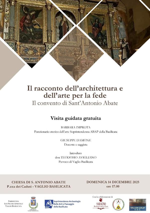 Domenica 14 Dicembre 2025, alle ore 17:00, la Soprintendenza Archeologia Belle Arti e Paesaggio della Basilicata e la Parrocchia di S. Pietro Apostolo di Vaglio Basilicata, in collaborazione con l’Amministrazione comunale, l’associazione Valium Group, la Protezione Civile e il restauratore Domenico Saracino, propongono una giornata di conoscenza e scoperta del Complesso conventuale di S. Antonio Abate, fondato sul finire del XVI secolo e rimasto attivo fino alla soppressione francese dell’inizio del XIX secolo.