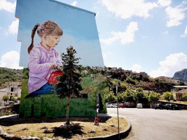 • il primo su una parte di circa 170 metri quadri nei pressi del campo sportivo, che ritrae una bambina mentre annaffia la sua terra, simbolo del rispetto dell’ambiente,
