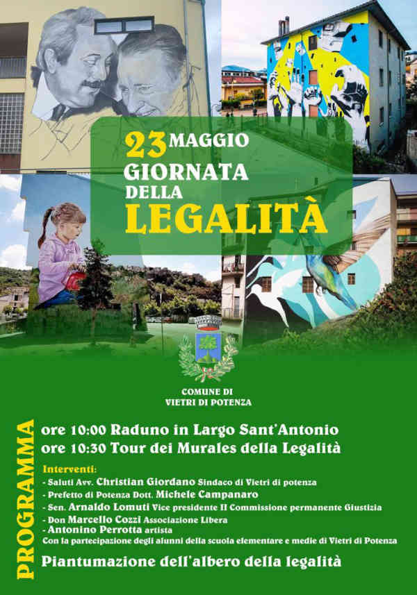 E’ in programma Lunedì 23 Maggio a Vietri di Potenza la “Giornata della Legalità“, organizzata dal Comune in occasione del 30° anniversario della strage di Capaci, dove persero la vita il giudice Giovanni Falcone, la moglie e gli agenti della scorta.