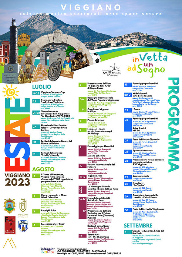 Viggiano – 25 luglio 2023. “In vetta ad un sogno”, è questa la frase di lancio per il cartellone degli eventi estivi 2023 del Comune di Viggiano.