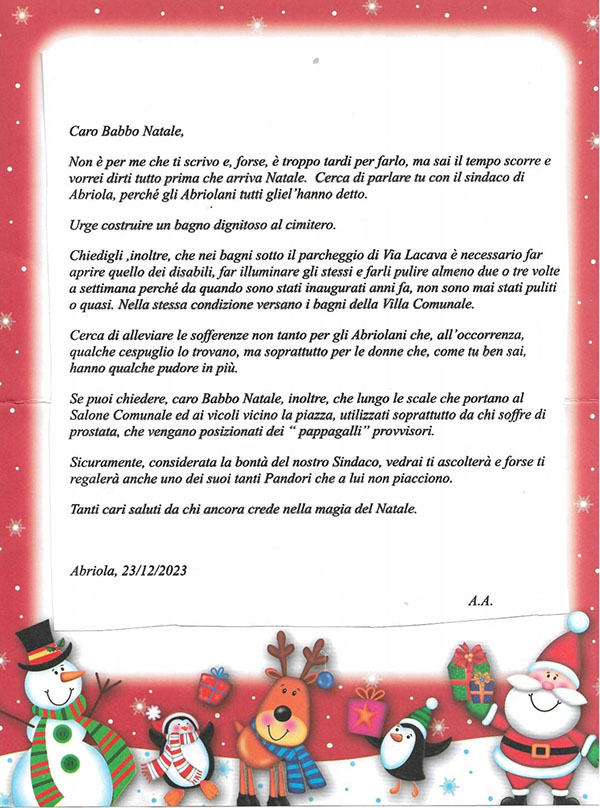 Il Comitato Amiamo Abriola e il Consigliere Domenico Triunfo hanno inviato una singolare lettera a Babbo Natale.
