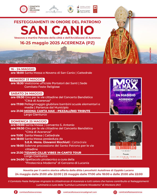 Oggi 25 Maggio 2025, Acerenza vivrà giorni indimenticabili in onore del suo Patrono, San Canio, Vescovo e martire, cuore spirituale della città e dell’Arcidiocesi.