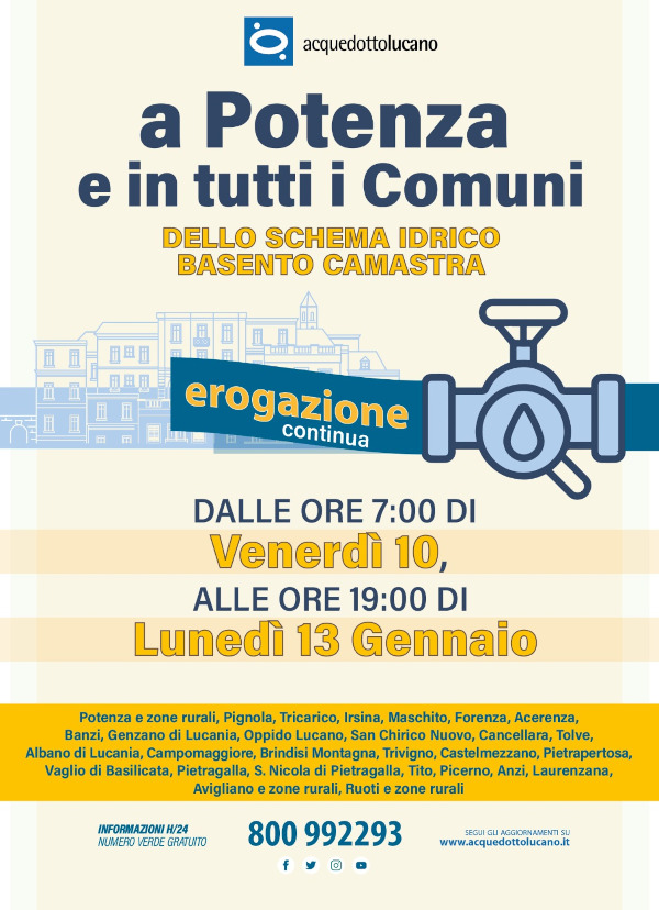 Il commissario per l’emergenza idrica, Vito Bardi, d’intesa con l’amministratore unico di Acquedotto Lucano, Alfonso Andretta, ha disposto i nuovi orari di erogazione nei 29 comuni serviti dallo schema Basento-Camastra a partire da venerdì 10 e fino a lunedì 13 gennaio.