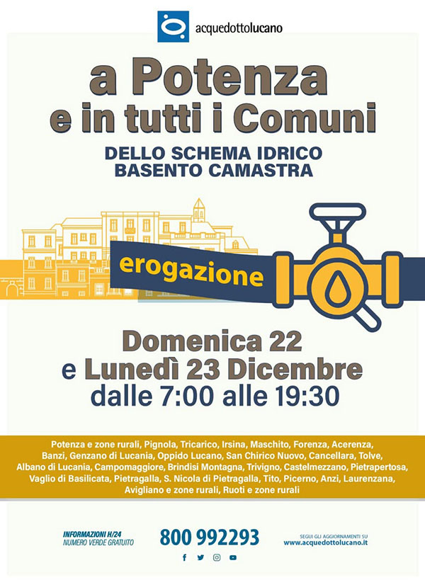 Con l’approssimarsi delle festività natalizie, Acquedotto Lucano rende noto il nuovo calendario di interruzioni valide per Domenica 22 Dicembre e Lunedì 23 Dicembre.