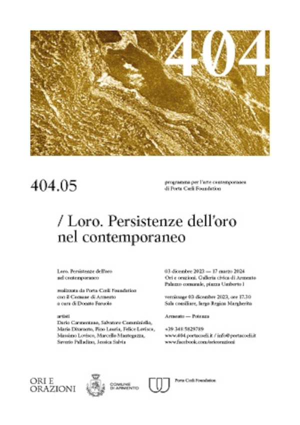 “Loro. Persistenze dell’oro nel contemporaneo” è una collettiva di nove artisti lucani: Dario Carmentano, Salvatore Comminiello, Maria Ditaranto, Pino Lauria, Felice Lovisco, Massimo Lovisco, Marcello Mantegazza, Saverio Palladino, Jessica Salvia.