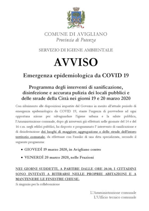 Con riferimento alle disposizioni impartite dal Governo in merito all’attuale periodo di emergenza epidemiologica da COVID 19, stante l’urgenza di provvedere ad ogni opportuna azione per salvaguardare l’igiene urbana e la salute pubblica, l’Amministrazione comunale di Avigliano, dopo gli interventi già effettuati nelle giornate del 14 e del 16 cm. negli edifici pubblici, ha disposto e programmato l’intervento di sanificazione e di disinfestazione dei luoghi di maggiore aggregazione e delle strade dell’intero territorio comunale, da effettuare con l’ausilio di una ditta specializzata, secondo il seguente programma: