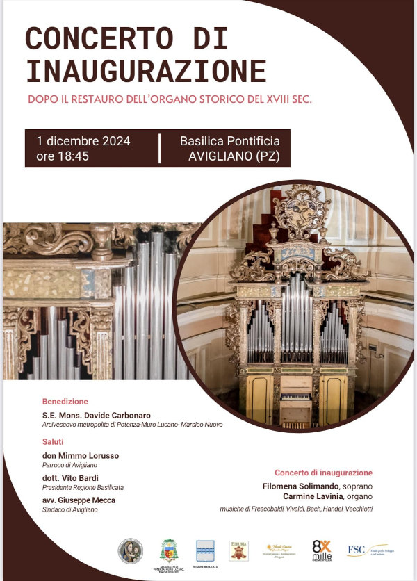 L’evento sarà accompagnato dalla benedizione di Mons. Davide Carbonaro, Arcivescovo Metropolita di Potenza-Muro Lucano-Marsico Nuovo, e vedrà le esibizioni del soprano Filomena Solimando e dell’organista Carmine Lavinia, con un programma musicale che includerà opere di Frescobaldi, Vivaldi, Bach e Handel.