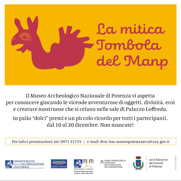 “Quest’anno, nell’ambito del cartellone “Natale in Città” del Comune di Potenza, il Museo Archeologico Nazionale di Potenza (MANP) organizzerà una tombola a tema mitologico per i ragazzi delle quinte di tutte le scuole della città.