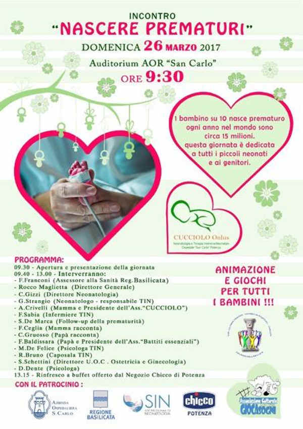 L’associazione “Cucciolo Onlus” ha organizzato un incontro dal titolo “Nascere Prematuri” presso Auditorium dell’Ospedale “San Carlo” di Potenza, a partire dalle ore 9:30 di Domenica 26 Marzo 2017.