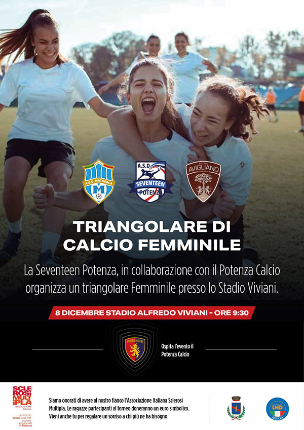 Giovedì 8 dicembre alle ore 9.30 presso lo Stadio Alfredo Viviani, l’ASD Seventeen Potenza, in collaborazione con il Potenza Calcio, organizza un triangolare di calcio femminile con le squadre ASD Matheola ed Avigliano Calcio: occasione per visionare da vicino le ragazze, diffondere la pratica sportiva in rosa e alimentare la solidarietà.