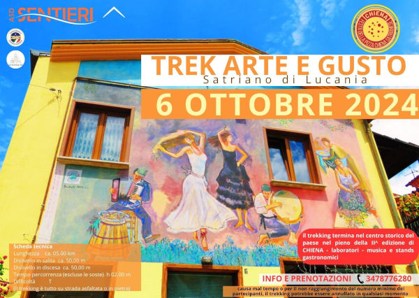 Domenica 6 ottobre 2024, in occasione della II^ edizione di CHIENA (la festa della Pizza Chiena Satrianese), l’ASD SENTIERI, organizza un originale trekking urbano tra i murales.