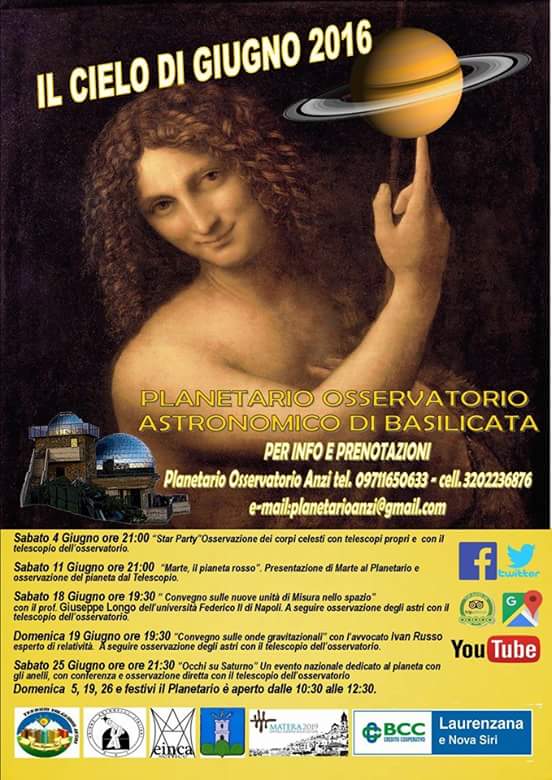 Inoltre il 18 Giugno ci sarà il prof. Longo dell’Università Federico II di Napoli che parlerà delle nuove unità di misura dello Spazio mentre il 19 Giugno l’avv. Ivan Russo illustrerà le Onde Gravitazionali con la presenza di diversi relatori del mondo accademico.