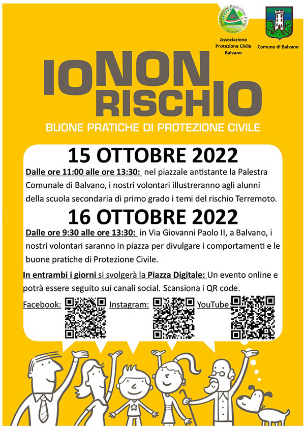 - Domenica 16/10/2022, dalle ore 9:30 alle 13:00: La manifestazione si svolgerà in via Giovanni Paolo II, affinchè tutti i Balvanesi possano essere informati sul rischio terremoto e sulle buone pratiche di Protezione Civile.