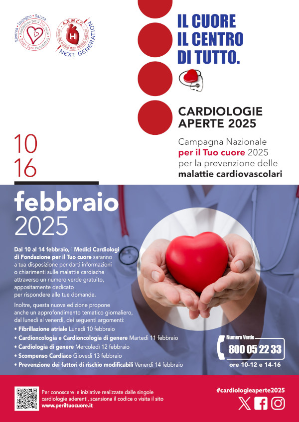 La Fondazione per il Tuo cuore HCF ONLUS dei Cardiologi Ospedalieri ANMCO, che da oltre venti anni si impegna attivamente nella ricerca e nella prevenzione cardiovascolare, dal 10 Febbraio al 16 Febbraio, in occasione di San Valentino, lancia l’iniziativa nazionale di prevenzione cardiovascolare “Cardiologie Aperte 2025”, giunta alla sua diciannovesima edizione.