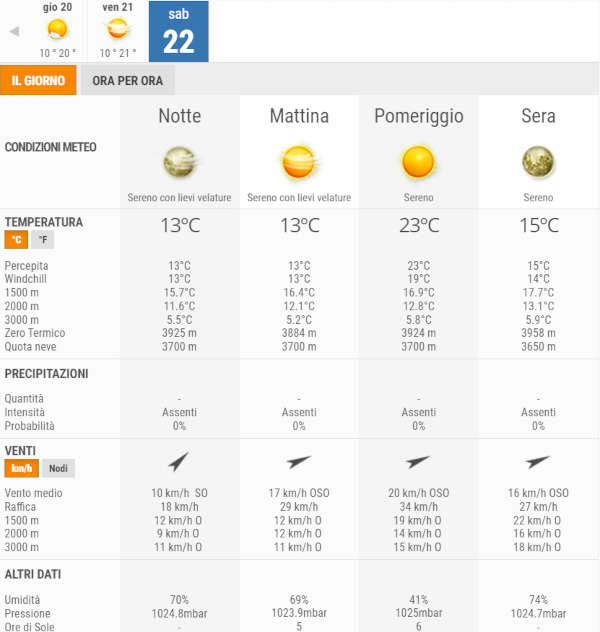 Sabato 22 Ottobre, invece, bel tempo con sole splendente per l’intera giornata, non sono previste piogge.