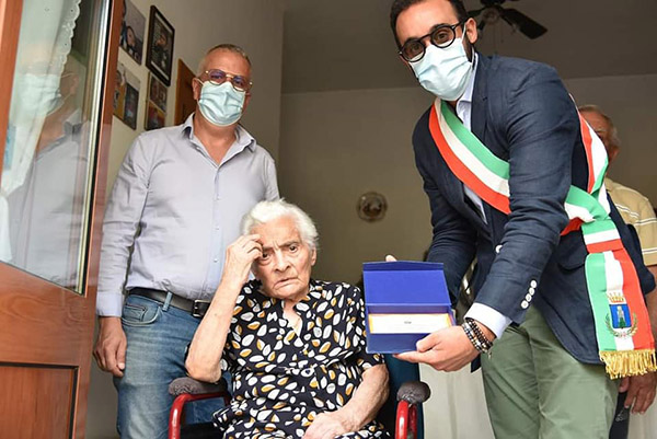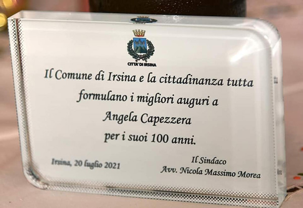 In dono per lei una targa con la quale sono stati formulati i migliori auguri da parte di tutta la cittadinanza.