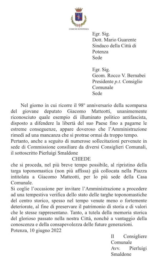 Ho chiesto infatti, anche a seguito di numerose sollecitazioni, che si proceda, nel più breve tempo possibile, al ripristino della targa toponomastica (non più affissa) già collocata nella Piazza intitolata a Giacomo Matteotti, per lo più sede della Casa Comunale.