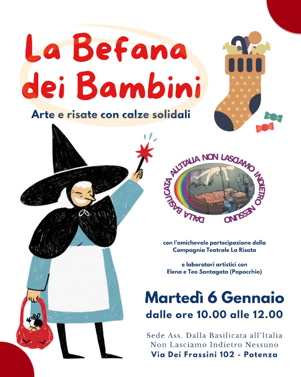 L’Associazione Dalla Basilicata all’Italia – Non lasciamo indietro nessuno annuncia con entusiasmo l’edizione 2026 de La Befana dei Bambini, in programma martedì 6 gennaio presso la sede associativa in via dei Frassini 102 a Potenza.