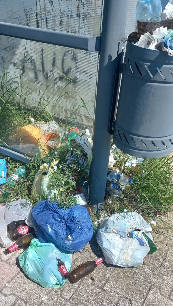 Le immagini parlano da sole: rifiuti abbandonati ovunque, bottiglie rotte, sacchi lasciati a terra, sporcizia diffusa e totale incuria.