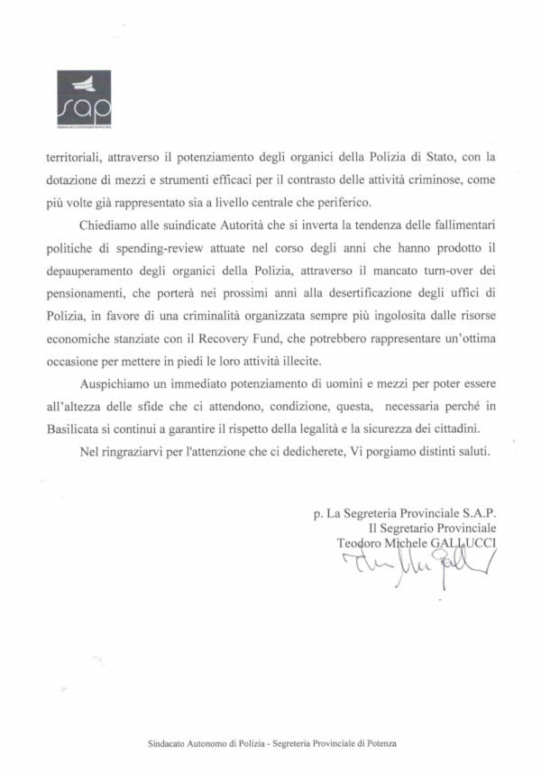 Chiediamo alle suindicate Autorità che si inverta la tendenza delle fallimentari politiche di spending-review attuate nel corso degli anni che hanno prodotto il depauperamento degli organici della Polizia, attraverso il mancato turn-over dei pensionamenti, che porterà nei prossimi anni alla desertificazione degli uffici di Polizia, in favore di una criminalità organizzata sempre più ingolosita dalle risorse economiche stanziate con il Recovery Fund, che potrebbero rappresentare un’ottima occasione per mettere in piedi le loro attività illecite.