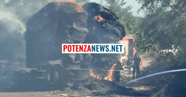 Pare che delle balle di fieno trasportate su un autotreno abbiano preso fuoco.