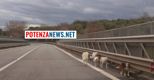 Su un ponticello tra l’uscita Rapolla e l’uscita Rapolla/Barile, 6 cani, visibilmente spaesati e probabilmente abbandonati, stanno passeggiando sulla corsia.