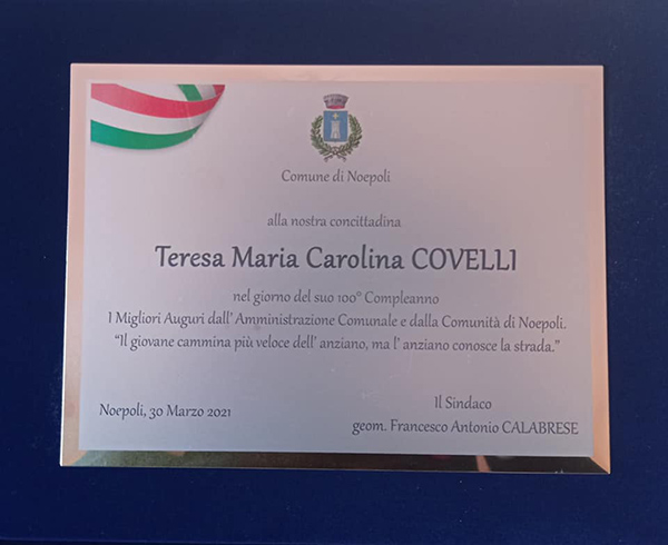 Oggi si festeggiano i 100 anni di Teresa Maria Carolina Covelli che ha ricevuto in dono, per celebrare l’evento, una targa dall’amministrazione comunale e dal Sindaco.