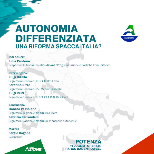 “Autonomia differenziata, una riforma spacca Italia?”, è questo il titolo del dibattito a più voci organizzato da Azione Basilicata e che si terrà il prossimo 19 luglio a Potenza, alle ore 18, presso il Parco Baden Powell.