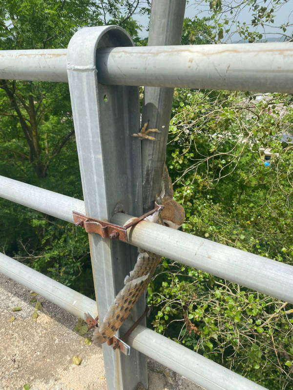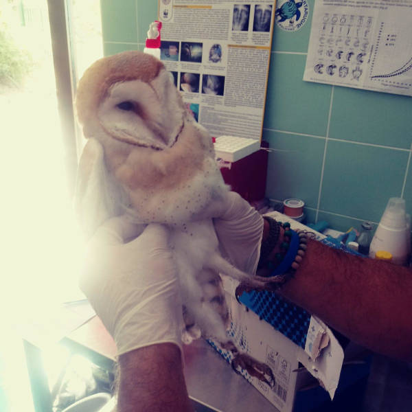 “Quello che vedete nelle foto è un grosso barbagianni, un uccello ritrovato questa mattina incastrato in un guard rail con una zampina rotta purtroppo.