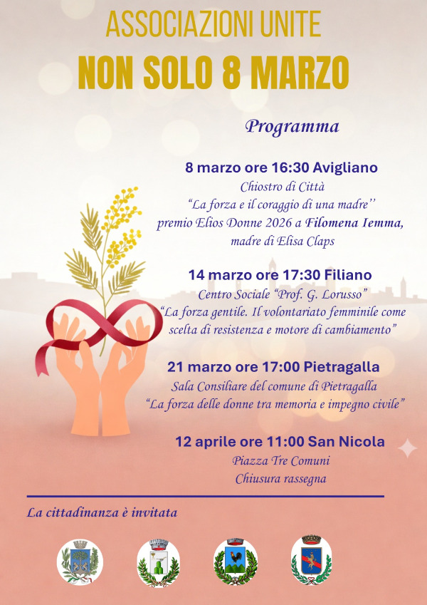 Al via la seconda edizione della rassegna intercomunale “Non solo 8 Marzo”, l’iniziativa che vede unite le comunità di Avigliano, Filiano, Pietragalla e Potenza in un percorso itinerante di cultura, memoria e impegno civile.