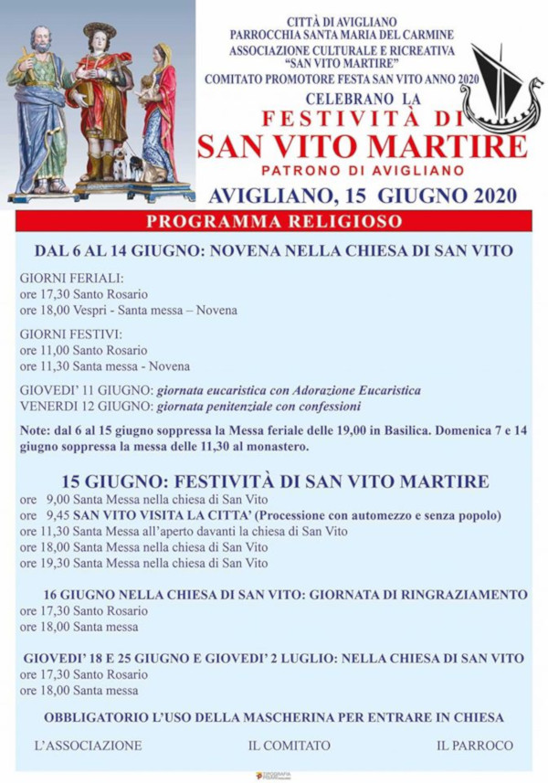 Inoltre si informa la popolazione che, la mattina del 15 giugno 2020, il Santo Patrono verrà portato in processione, vietato l’assembramento e la partecipazione del popolo dietro la statua”.