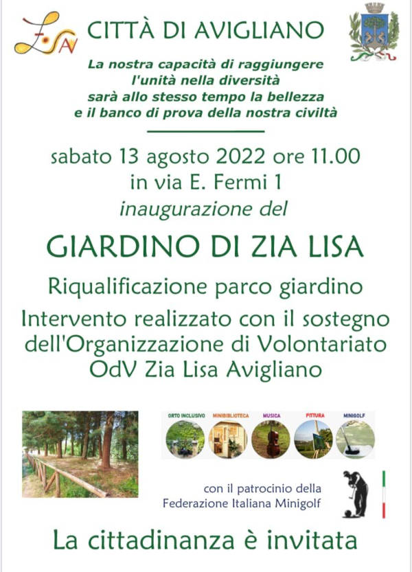 “un parco giardino che nasce nel cuore di Avigliano, vocato all’inclusione sociale, allo sport, alla musica e alla cultura, che abbiamo sostenuto convintamente come amministrazione comunale, autorizzandone l’iter progettuale e concedendo in gestione l’area verde.