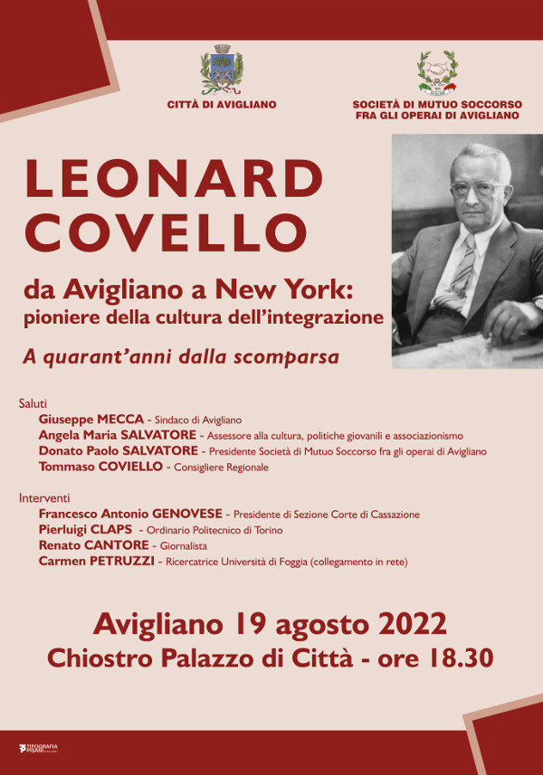 A quarant’anni dalla scomparsa di Leonard Covello, il Comune di Avigliano organizza – il 19 agosto alle 18.30 Chiostro del Palazzo di Città – un convegno per ricordare un illustre concittadino emigrato negli Stati Uniti nel 1897.