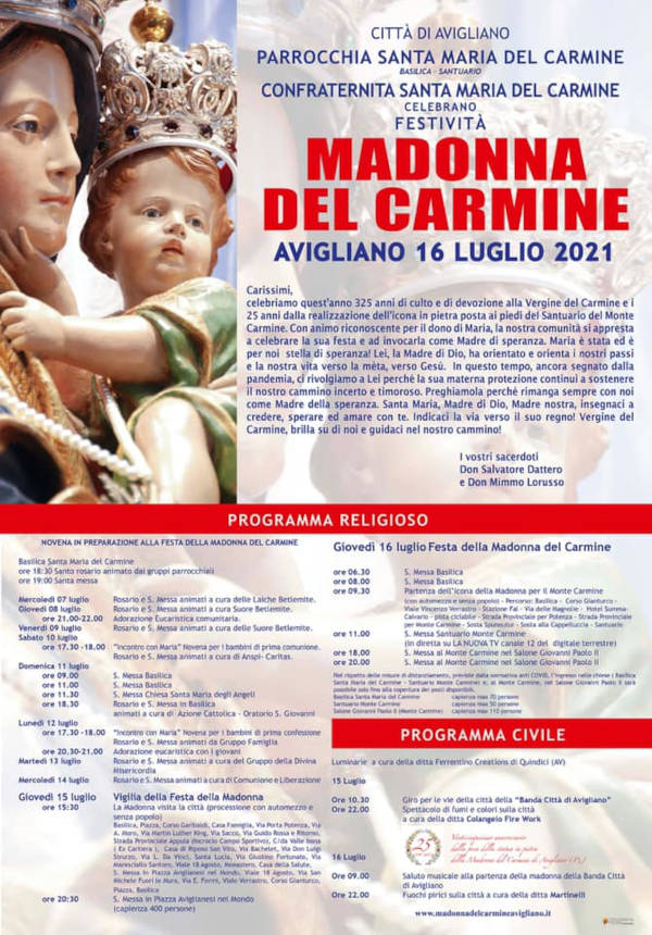 Come detta la tradizione religiosa, dal 7 al 15 Luglio si sviluppa la novena in onore della Vergine, che anticipa la processione di Domenica 16.