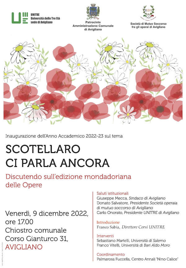 Gli illustri relatori, insieme, a Franco Sabia, Direttore dei corsi UNITRE di Avigliano, Carlo Onorato, Presidente dell’UNITRE di Avigliano, Donato Salvatore, Presidente della S.O.M.S. di Avigliano e Giuseppe Mecca, Sindaco di Avigliano, discuteranno sull’edizione mondadoriana delle opere che chiamano in causa la figura di Rocco Scotellaro.