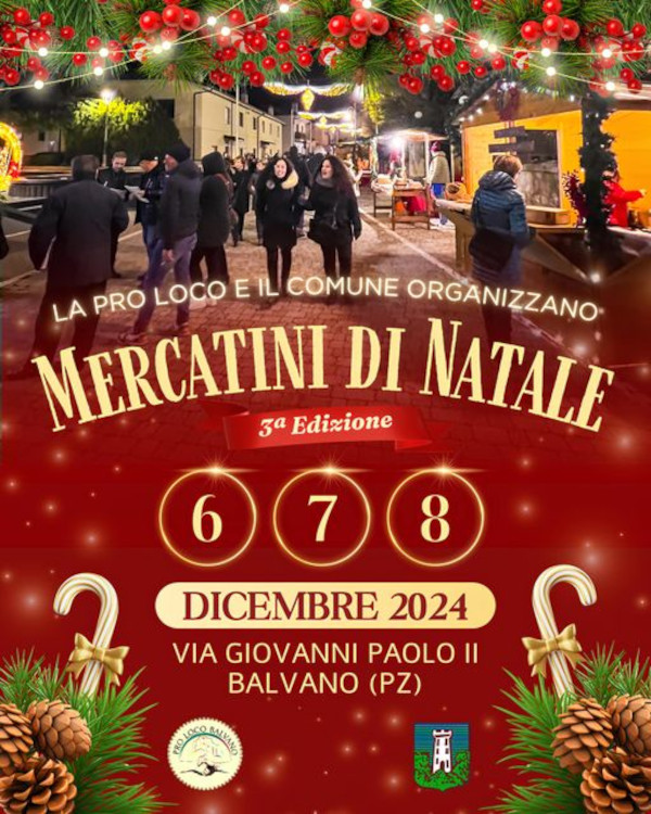 Il 6, 7 e 8 Dicembre 2024, Balvano ospiterà la terza edizione dei Mercatini di Natale in Via Giovanni Paolo II.