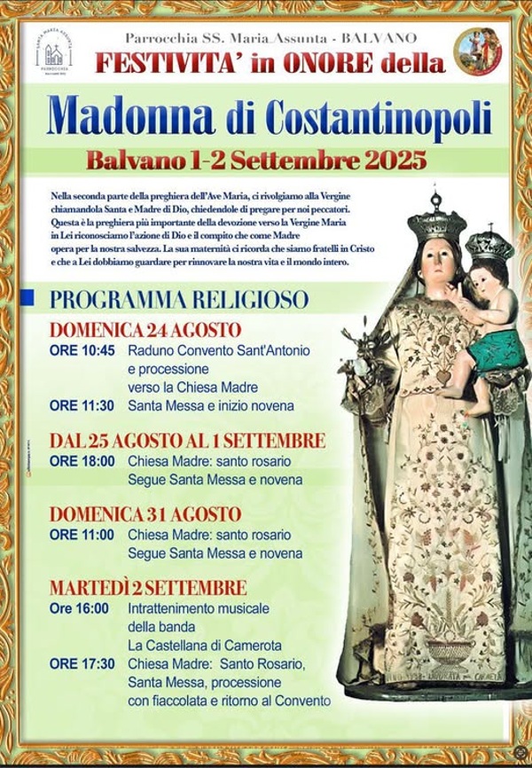 Appuntamento al 24 Agosto a Balvano per stringersi in preghiera in onore della Madonna di Costantinopoli.