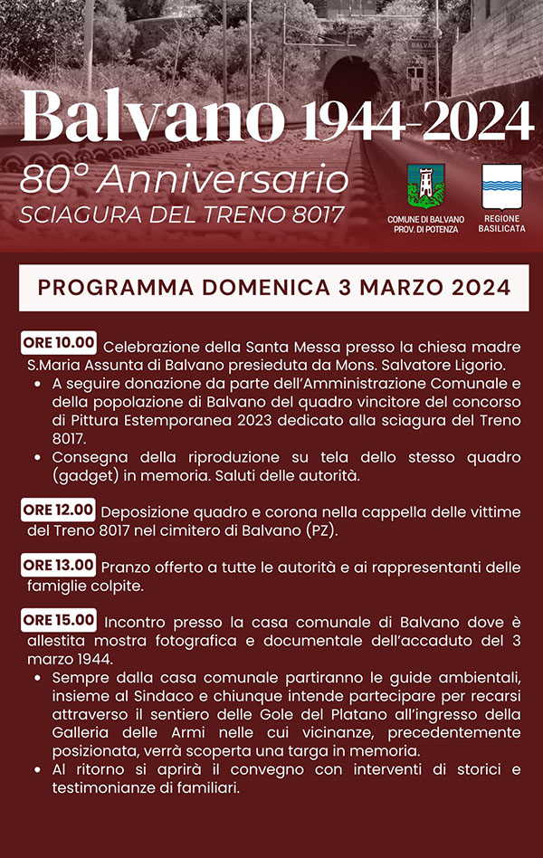 Ecco quindi che il 3 Marzo 2024 Balvano commemora l’80° anniversario della sciagura ferroviaria avvenuta proprio il 3 marzo 1944 nella Galleria delle Armi.